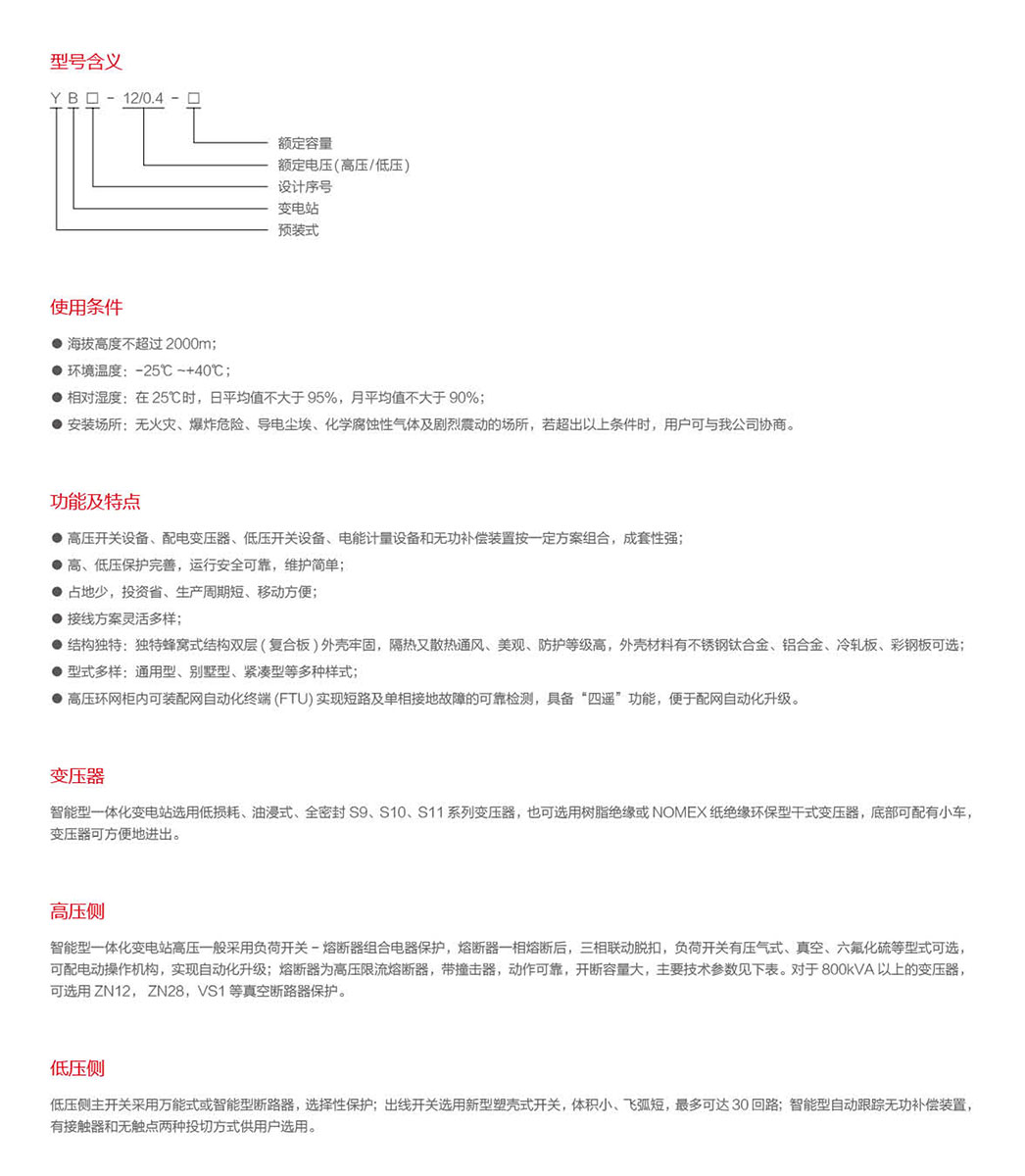 YB□-12/0.4(F·R) 高、低压预装式变电站(欧式)广泛用于城市电网改造、住宅小区、高层建筑、工矿、宾馆、商场、机场、铁路、油田、码头、高速公路以及临时性用电设施等户内外场所。