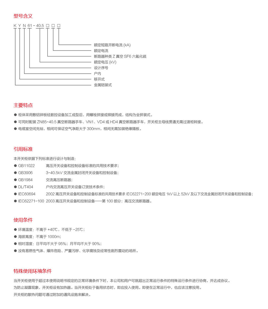 KYN61-40.5铠装式金属封闭开关设备(简称开关柜)系我厂在原产品的基础上设计改进的开关设备。它适应于三相交流50Hz电力系统,用于接受和分配电能并对电路进行控制、保护及监测。