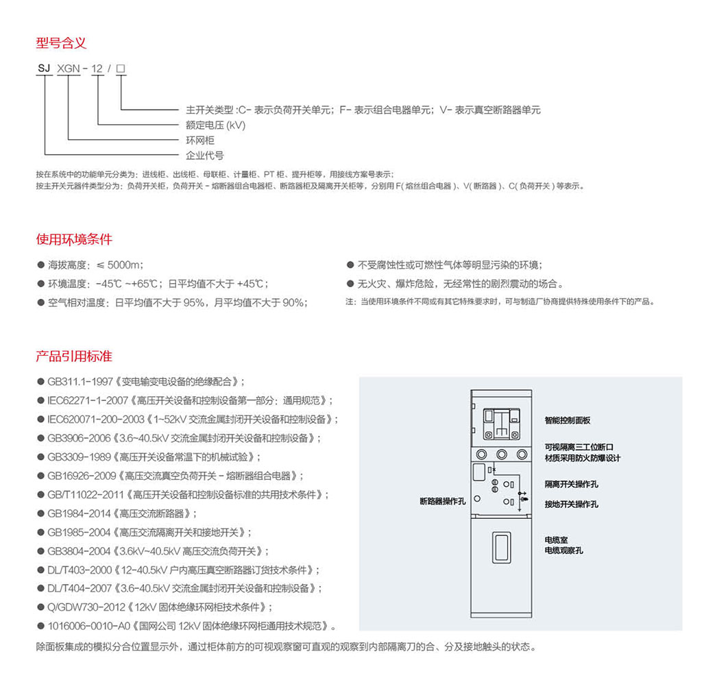 SJXGN-12固体绝缘环网柜开关设备是本公司自行研发的新一代环保型固体绝缘环网柜。是采用固体绝缘材料为主绝缘介质及导电连接、隔离开关、接地开关、主母线、分支母线等主导电回路单一或组合后用固体绝缘介质包覆封装为一个或几个具有一定功能、可再次组合或扩展的具备全绝缘、全密封性能的模块。