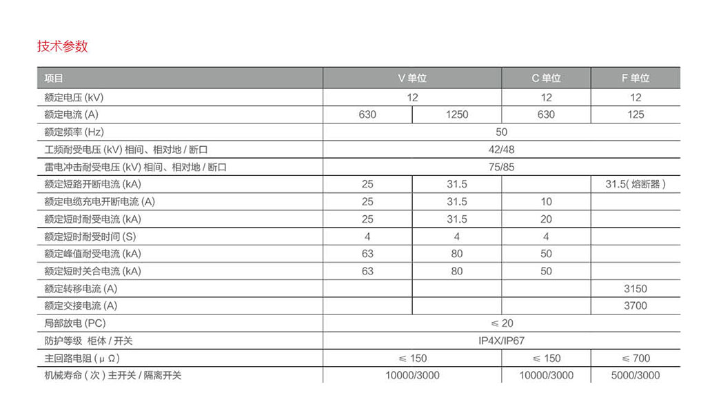 固体绝缘环网柜开关设备主要由三种功能单元组成,即V单元(断路器单元),C单元(负荷开关),F单元(组合电器单元),每个单元可以单独使用也可以自由扩展,其结构分为智能控制仪表室、操作机构和一次部分,仪表室可配微机保护(控制器),机构为专用弹操机构,一次部分采用APG自动凝胶工艺,将隔离开关和灭弧室完全封在环氧树脂中,并有专用接头和母线相边。灭弧室的设计开关选用灭弧室采用专用的铜铬触头材料,R型纵磁场触头,以及完全一次封排工艺,该灭弧室开断短路电流能力、稳定性、电寿命、温升以及绝缘水平都较之前的灭弧室(铜铝触头材料,杯状纵磁场触头结构,以及不完全一次封排工艺)有了明显提高。操动机构采用与开关配合一体的弹操机构,即隔离开关和主开关弹操机构为一整体,可方便实现互锁,而且机构零件少,减少了不必要的传动环节,可靠性高,并可根据用户需要加装电动操作。